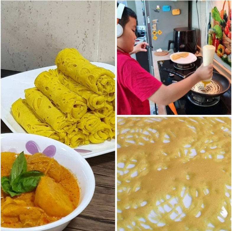 On a different occasion, I made lacy pancakes or Roti Kirai, it is very easy, the ingredients are just flour, egg, turmeric and salt. I heat up the pan and make circular patterns on the pan. Once its done, I rolled it up and my mother cooked curry chicken to accompany it. Cooking is fun and its a survival skill, don't be shy to help out our parents at home.