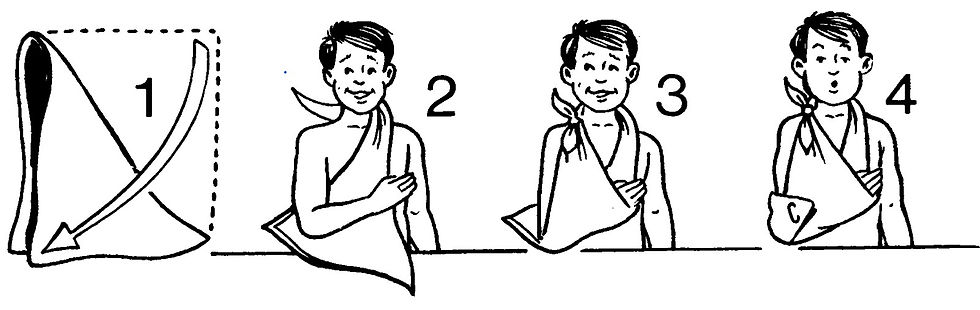 During the first aid course, we learned how to use the triangular bandage as an arm sling, knee and head bandage.